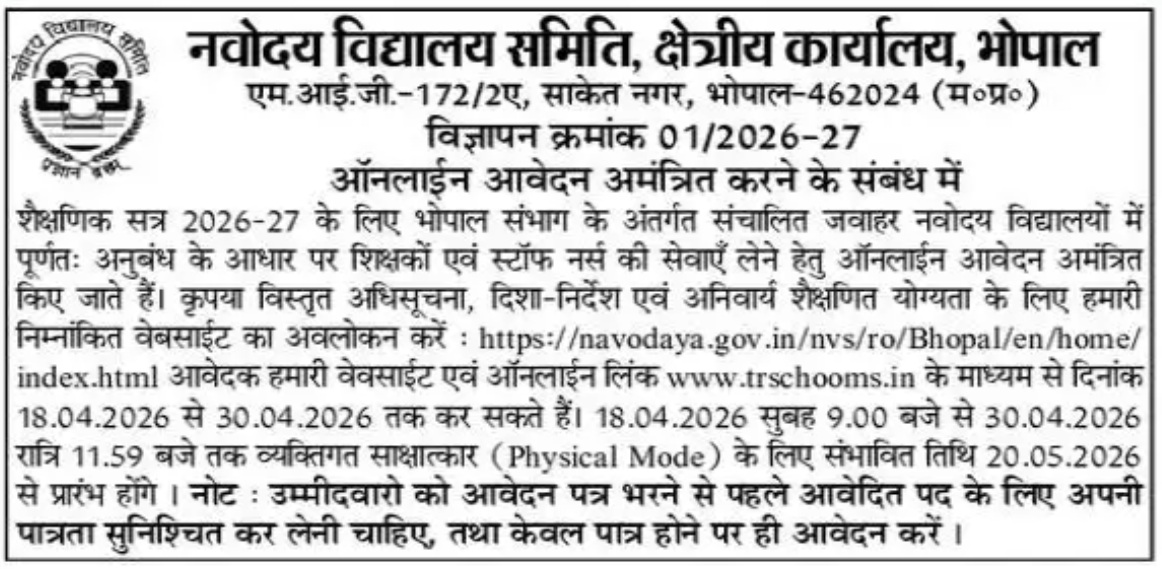 नवोदय विद्यालय समिति द्वारा शैक्षणिक सत्र 2026-27 के लिए म.प्र. ,छत्तीसगढ़ और ओडिशा राज्यों के जेएनवी विद्यालयों में अनुबंध (Contract) के आधार पर विभिन्न पदों पर भर्ती के लिए अधिसूचना प्रकाशित की है, वे उम्मीदवार जो इन रिक्त पदों में रुचि रखते हैं, और सभी आवश्यक योग्यताएं पूर्ण करते हैं ऑनलाइन आवेदन कर सकते हैं । यह भर्ती अनुबंध (Contract) के आधार पर है, जो प्रारंभिक रूप से निर्धारित तिथि तक के लिए होगी और बाद में आवश्यकता अनुसार बढ़ाई जा सकती है। यह भर्ती मध्य प्रदेश, छत्तीसगढ़ और ओडिशा राज्यों के जेएनवी के लिए है। Navodaya Vidyalay Bharti 2026 की संपूर्ण जानकारी नीचे लेख में दी गई है ।